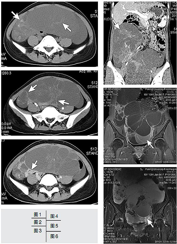 图5和图6 磁共振成像(MRI),分别为脂肪抑制T1WI和脂肪抑制T2WI,冠状位,病变的多囊状结构显示更为清楚,多数囊内为T1较低信号和T2较高信号的液体,少数囊内T1WI与T2WI信号均较高,提示囊内液体的蛋白含量高或曾有过出血(箭号),盆腔内积液不明显。