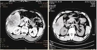 效果:经过一个疗程的治疗后复查,CT显示瘤体明显缩小,腹水全部消失。疼痛症状有效缓解,食欲增强,体重略有增加,精神状况明显好转,生活质量显著提高,生活可自理。2014年5月再次到医院复查,身体恢复良好,可像正常人一样生活。