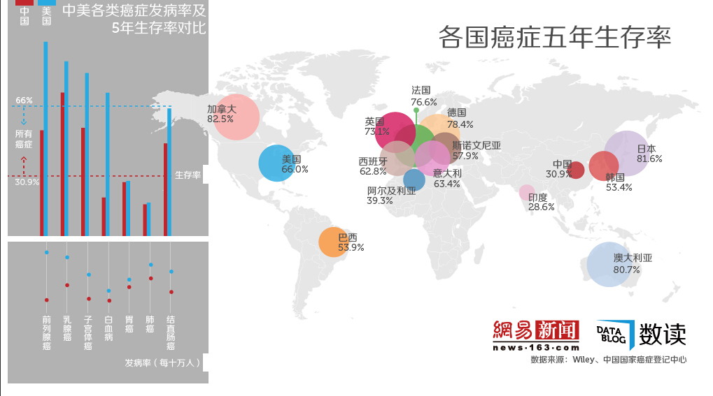 中国癌症的发病率并不算非常高,但癌症患者的生存率很低。据国家癌症登记中心和癌症防控办公室对全国17个癌症登记处、13.9万个病例的分析统计,中国癌症患者五年生存率为30.9%,仅为美国(66%)的一半。而据此前英国医学杂志《柳叶刀》(The Lancet)刊登的文章,全世界癌症五年生存率最高的国家是加拿大,100个加拿大癌症患者中,有82个在接受治疗后可以生存5年以上,而手术5年后,癌症的复发率也大大降低。除加拿大外,日本、澳大利亚和大部分西欧国家癌症患者生存率也很高,普遍都在70%以上,中国、印度、阿尔及利亚等国属于癌症生存率较低的国家,五年生存率不到40%。
